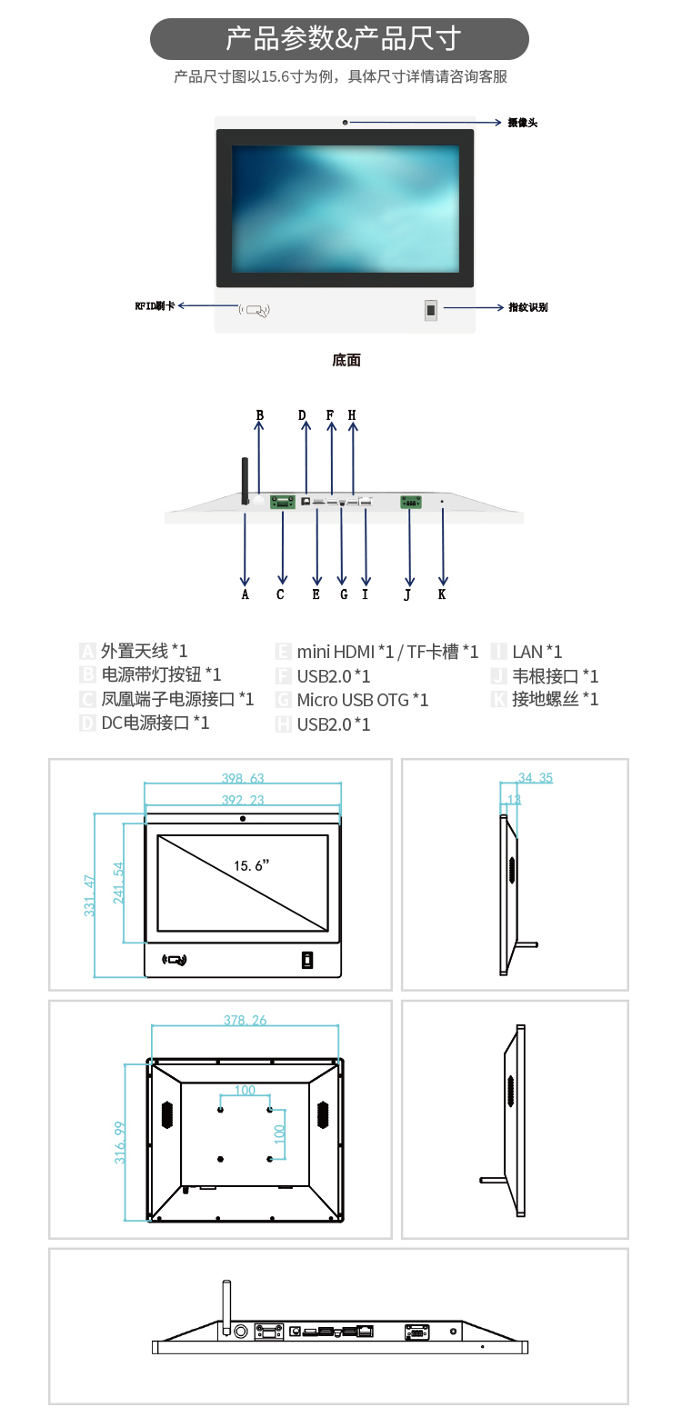 詳細(xì)信息 {安卓一體機(jī)}外觀優(yōu)點(diǎn):ABS前面框+鈑金件烤漆后殼,前面框ABS設(shè)計(jì),主要是讓RFID(刷卡)信號(hào)不要被金屬類所干擾,ABS面板采用高溫抗UV油漆,延緩ABS黃化;鈑金件后殼設(shè)計(jì),主要是考慮到壁掛式承重能力,使產(chǎn)品更加堅(jiān)固耐用。