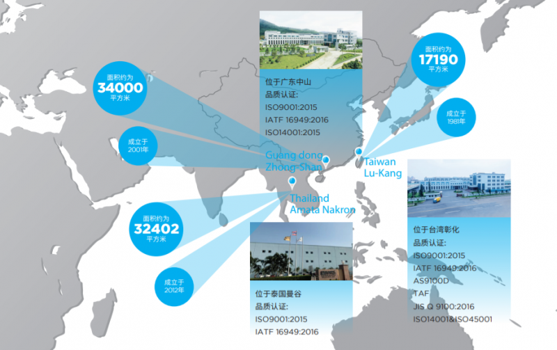 為掌握貿(mào)易優(yōu)勢,繼茂橡膠自1986年成立以來分別在臺灣、大陸、泰國三地建置廠房,總面積約為83592平方米。品質(zhì)認(rèn)證包括ISO9001:2015、IATF 16949:2016、AS9100D、TAF、JIS Q 9100:2016、ISO14001&ISO45001等。