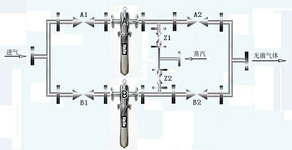 1安裝時,按照過濾器上的空氣進出口標簽連接好管道。否則將進出口反裝會影響過濾效果。為了便于使用和更換維修,過濾器應按下圖所示的管線進行安裝。